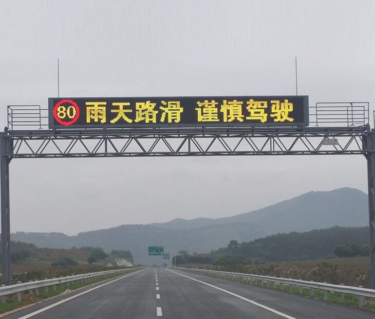 用于顯示道路的相關信息(事故、道路維護、惡劣氣象),對交通進行誘導。門架式可變情報板由設置在控制箱內的微處理器操作,微處理器通過信號傳輸系統和監控中心計算機相連。